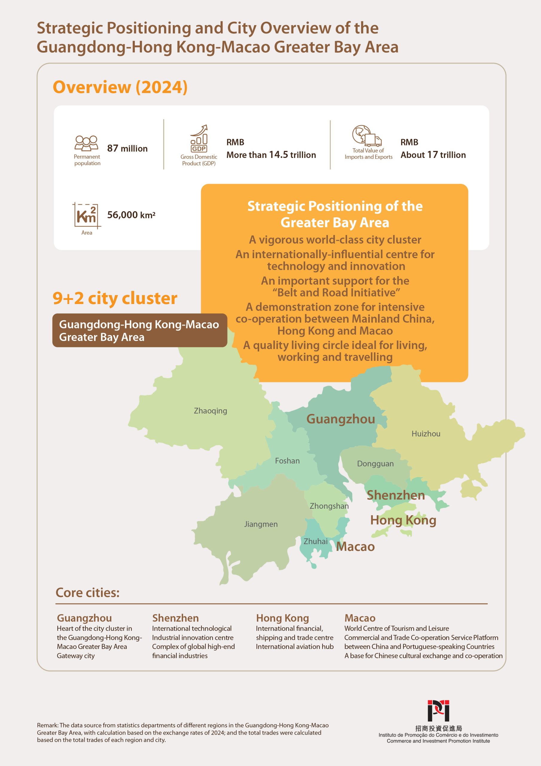 Guangdong-Hong Kong-Macao Greater Bay Area covers Macao Special Administrative Region, Hong Kong Special Administrative Region and nine cities in Guangdong Province, namely, Guangzhou, Shenzhen, Zhuhai, Foshan, Huizhou, Dongguan, Zhongshan, Jiangmen and Zhaoqing. As of 2022, the Greater Bay Area occupied a total area of around 56,000 square kilometres and had a population of more than 80 million; the GDP of the area was over RMB13 trillion, making the area one of the regions that features strong economic vitality and a high degree of openness and internationalisation in China.